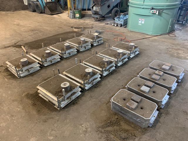 上型と下型を組み合わせて完成した鋳型が並べられています。