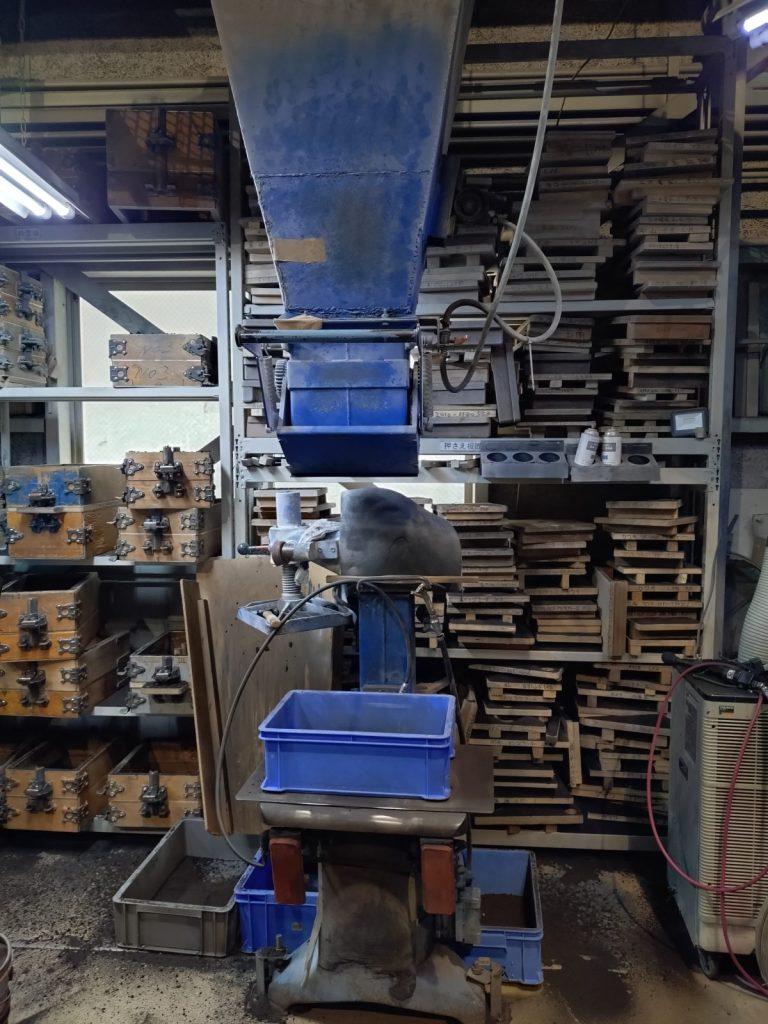 生型鋳造は全部人の手で作業しますが、プレート型鋳造では作業の所々で機械がアシストしてくれ、スピーディーに型込めをすることができます。