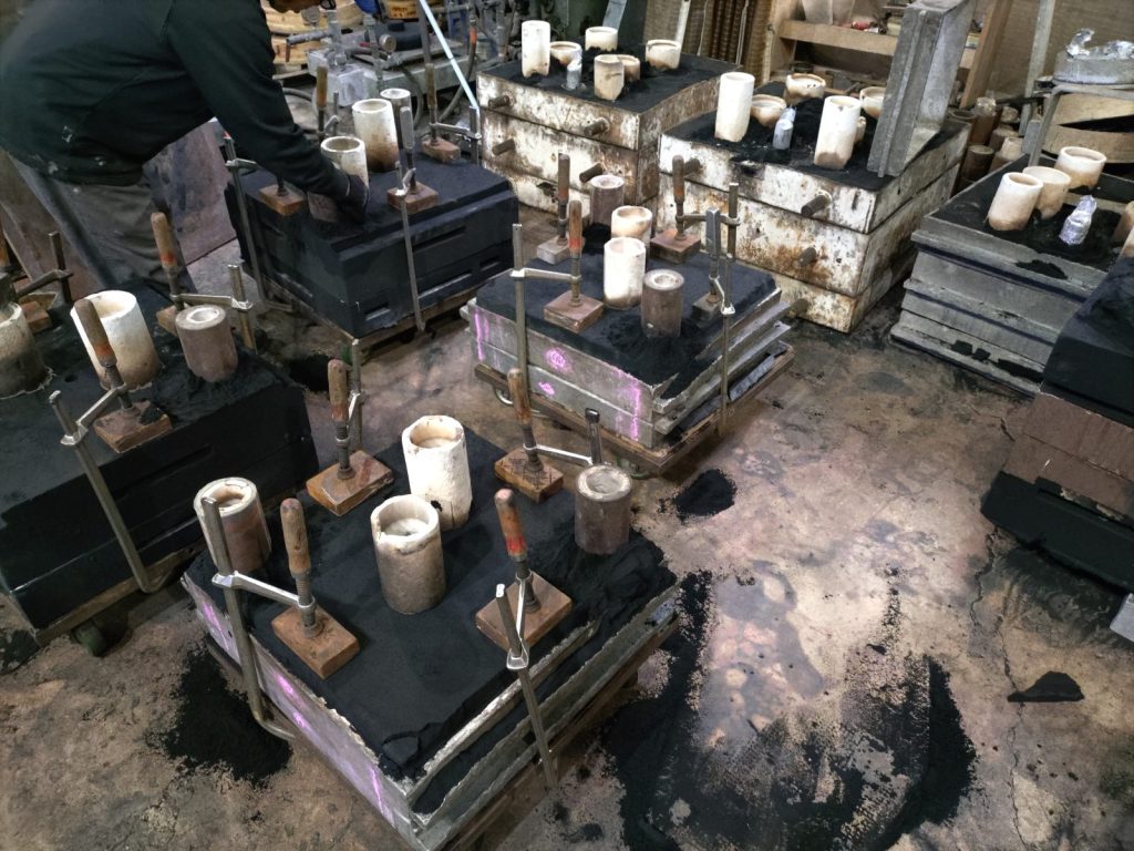 これは昔ながらの鋳造法です。この製法の利点は生砂を使用して鋳型を作り、鋳造が終わった鋳型は崩して砂場に戻し、